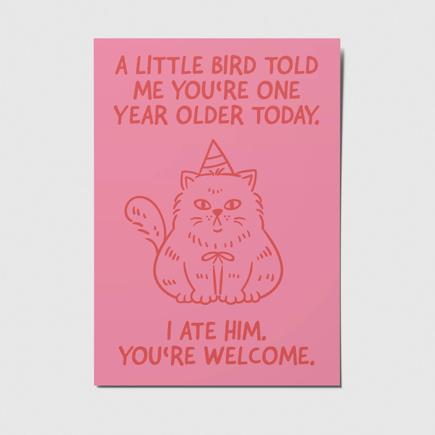 Etsitkö syntymĂ€pĂ€ivĂ€korttia, joka erottuu edukseen? TĂ€ssĂ€ huumorilla höystetyssĂ€ kortissa on kuva kissasta ja teksti: âA little bird told me you're one year older today. I ate him. You're welcome.â (suom. Pikkulintu kertoi, ettĂ€ olet tĂ€nÀÀn vuoden vanhempi. Söin hĂ€net. Ole hyvĂ€.)