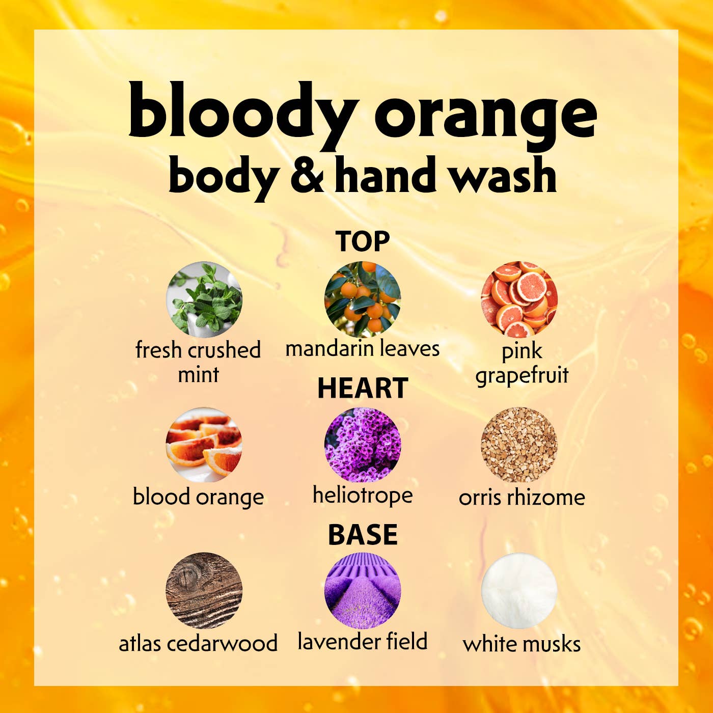 Koe virkistävä tunne ja eloisa tuoksu! Body & Hand Wash Bloody Orange on aromaattinen vartalo- ja käsipesuaine, joka on valmistettu 100 % luonnollisista raaka-aineista. Sen hellävarainen, vähän vaahtoava koostumus puhdistaa tehokkaasti, jättäen iholle pitkäkestoisen, vastapuristetun appelsiinin tuoksun.