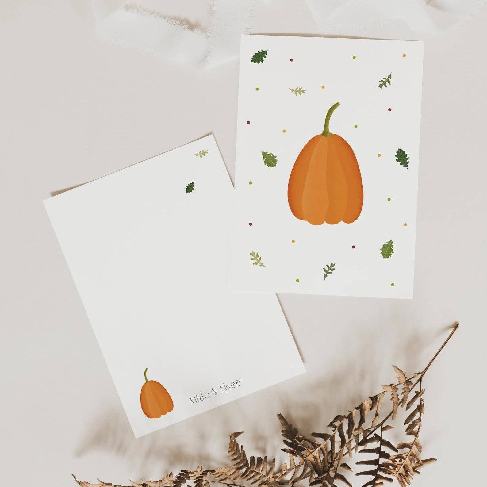 Etsitkö täydellistä syksyistä postikorttia lähettämään tervehdyksiä tai somistamaan kotiasi? Tämä ihastuttava kurpitsa-aiheinen postikortti tuo lämpimän tunnelman niin Halloweeniin kuin muuhunkin syksyiseen aikaan.