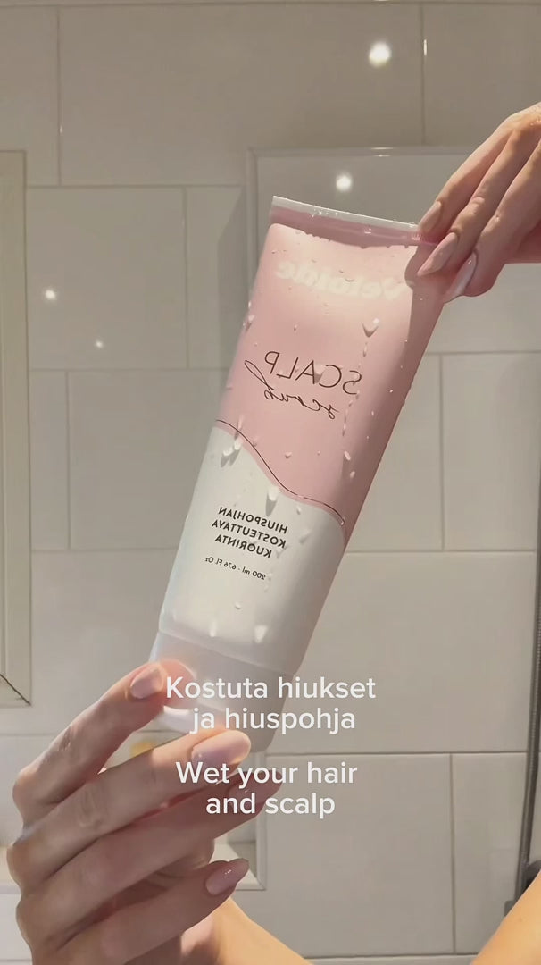 Veloiden Scalp Scrub on Suomessa valmistettu, hellävarainen mutta tehokas kuorintatuote, joka on kehitetty hiuspohjan kokonaisvaltaiseen hyvinvointiin. Tuotteen avulla hiuspohjasta poistetaan kuollutta ihosolukkoa, muotoilutuotteiden jäämiä ja muita epäpuhtauksia. Syväpuhdistava vaikutus vilkastuttaa hiuspohjan verenkiertoa ja optimoi pohjan vastaanottamaan hoitotuotteet entistä tehokkaammin.